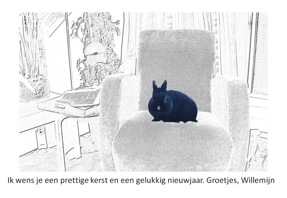 Onze nieuwjaarskaarten zijn vandaag gemaakt. Wewilden iets doen met onze gezichten. Spelend met photoshop kwamen er deze pentekeningen uit. Willemijn wilde eigen kaarten en had een duidelijk idee. Een tekening als achtergrond en een echte foto van droppie op de bank. Dat is ook gelukt (zie hieronder). |