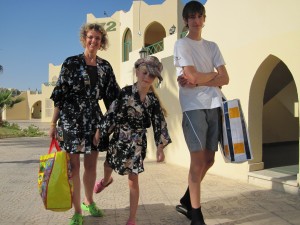 | We gaan dagelijks wandelen en langs winkeltjes. Met het afdingen is het een hele tijdsbesteding. Bijna alles is te krijgen voor de helft van de vraagprijs. Op de linkse foto kopen we parfum. Op de tweede foto staan we in de wadi naast het hotel. De derde foto is de gescheiden afvalinzameling en op de rechtse foto stapt Willemijn in één van de electrische tuktuks van het hotel. | |||||||||