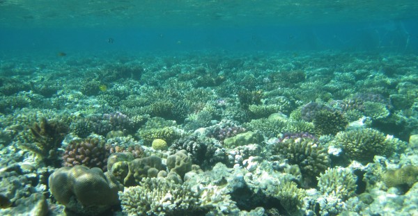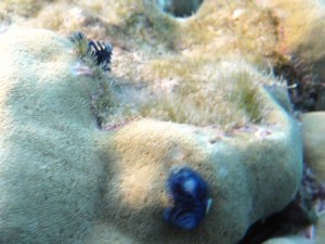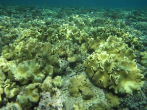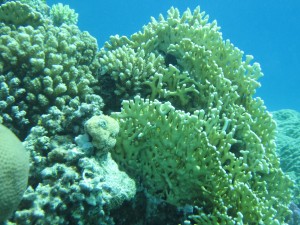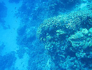 Het koraal zag er veel mooier uit dan we verwacht hadden. Behoorlijk kleurrijk en weinig dode punten. Sommige klompen reiken tot slechts 30 centimeter onder het wateroppervlak. Die ondiepte is meteen ook een toevluchtsoord voor de scholende vis omdat het zelfs voor ons snorkelaars niet begaanbaar is. De golfslag zou je steeds op het koraal duwen. | ||||||||