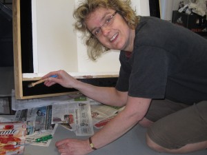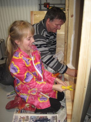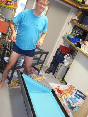 | Willemijn heeft bij Rob en José een tuinhuisje gezien en wil er graag ook één. Bij de Hornbach zien we een houten hondenhok en het plan krijgt meteen vorm. Het huisje krijgt een zijraam en wordt nauwgezet geverfd. Eerst witte grondverf, daarna van binnen hemelsblauw en van buiten zwart. Willemijn krijgt hulp van het gehele gezin maar doet zelf een substantieel deel van het verven. | ![]() |