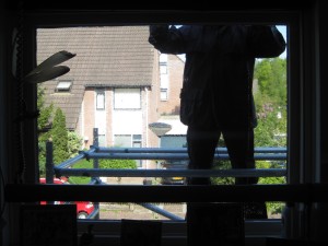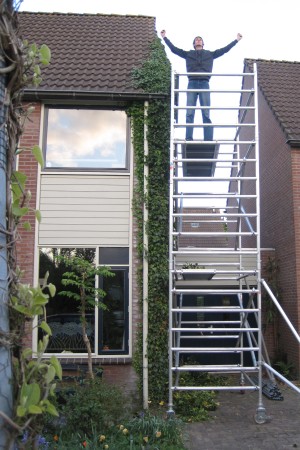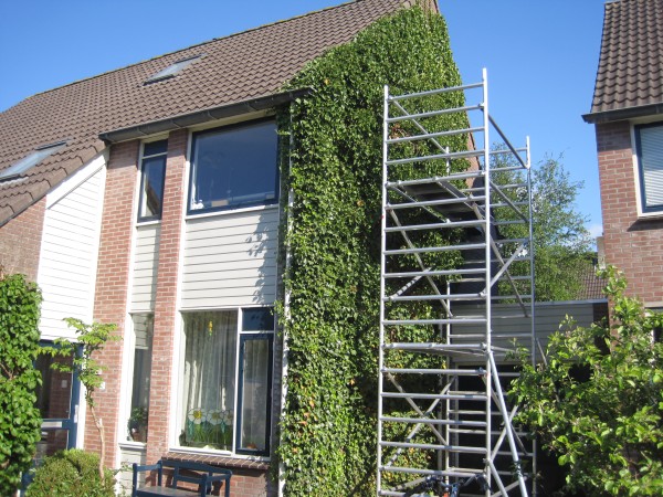 We huren een steiger en Janwillem is vol van de constructie. De hoogte maakt een oergevoel bij hem los. Marion is de specialist in het verven van ingewikkelde plekjes. Maarten is voor de grote vlakken en het plamuren. We hebben toch besloten de slaapplaats van de huismussen in de klimop te knippen. In deze periode van het jaar wordt hij nauwelijks gebruikt en de klimop kwam bijna een meter los van de muur. Het veroorzaakt wel (tijdelijk) een kale plek. |