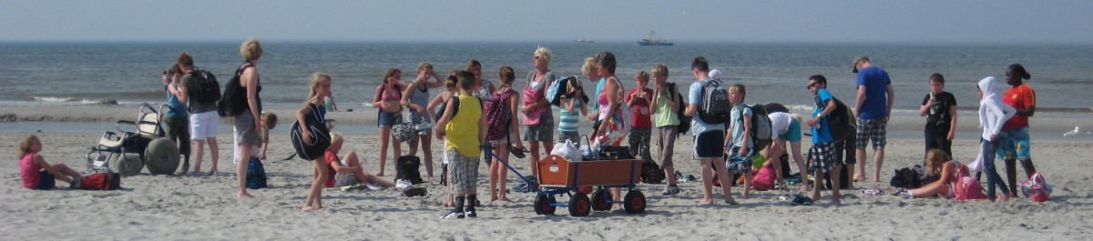 De vijfde klas van OBS De Wissel in Haren is vandaag op schoolreisje naar Ameland. Een heerlijke dag resulteerde in deze mooie panoramafoto op het strand. Willemijn is de zesde persoon van links met de grote zwarte rugzak. |
