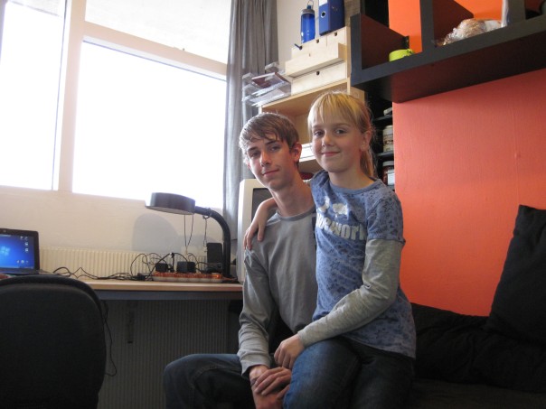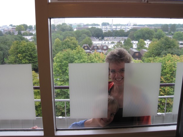 Vandaag zijn we op bezoek geweest bij Janwillem op zijn kamer in Delft. Hij woont nu op de bovenste verdieping van een gallerijflat samen met drie andere studenten: twee jongens en een meisje, technische natuurkunde en twee keer civiele techniek. Met de lift kun je naar de zesde verdieping en dan moet je met de trap één verdieping hoger. Buiten door de gallerij ligt de flat ongeveer midden tussen de twee trappenhuizen. Janwillem heeft het kleinste kamertje in huis. Ongeveer 7 vierkante meter. Niet veel ruimte, maar het is goed om te zien dat er alles in past. | |
