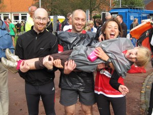 Willemijn loopt met het Arctisch Centrum van de Universiteit mee, met de 4Mijl van Groningen. Het is een hele afstand voor haar en af en toe moet ze even een stukje wandelen, maar ze bereikt de eindstreep in 45 minuten en 20 seconden. Bij de start wordt ze op handen gedragen. Veel publiek langs de route maakt het lopen erg leuk. En een grote medaille aan het einde. |