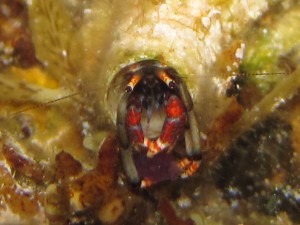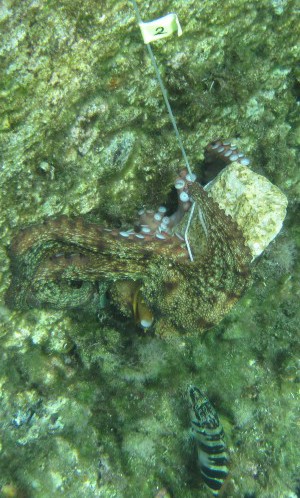 | een octopus speelt met de plotmarkering | drijvend aan het oppervlak Codium bursa | een hermietkreeftje | |||