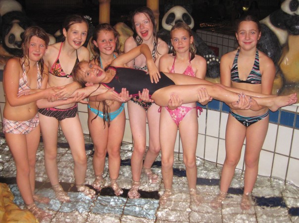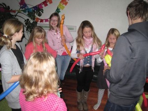 | We zijn gaan zwemmen in het "drakenzwembad" in Assen. De weg er naar toe was een speurtocht met trein en bus. Het begon met blindemannetje om de kado's te ontvangen, daarna taartje versieren, ballonnen tot honden draaien (les van Janwillem) en een tas vol lekkers inpakken. Daarna te voet op weg naar het station. | ||