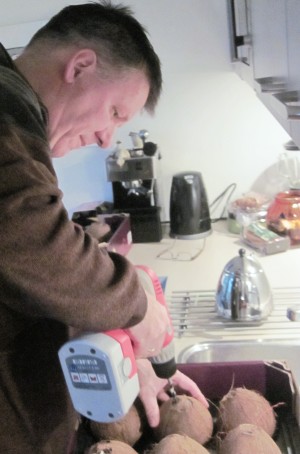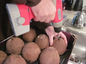 Eén dag na haar verjaardag en verjaardagsfeest staat Maarten om 7:45 uur 31 kokosnoten van gaten te voorzien. Dat gaat gelukkig redelijk gemakkelijk met een schroefboormachine. Kokosnoot nummer 32 wordt doorgezaagd en de kokos uit één helft wordt in kleine stukjes in een bakje verzameld om te proeven. Tenslotte leert Willemijn het geluid te maken van galopperende paarden. En kokosnoot nummer 33 gaat mee, zodat je het klotsen van de kokosmelk kunt horen. Op naar school.... | |