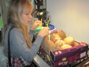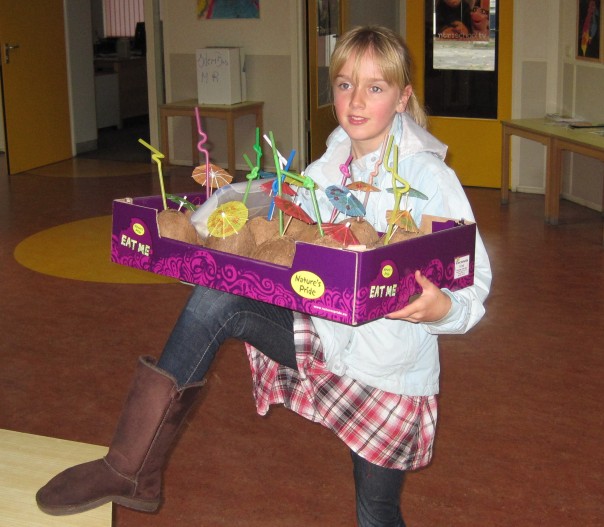 | Willemijn heeft het plan opgevat om in Hawaii sfeer te trakteren op school. Kokosnoten met rietjes en parapluutjes. | ||