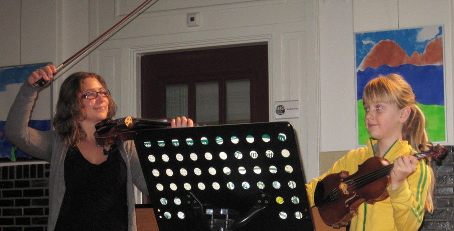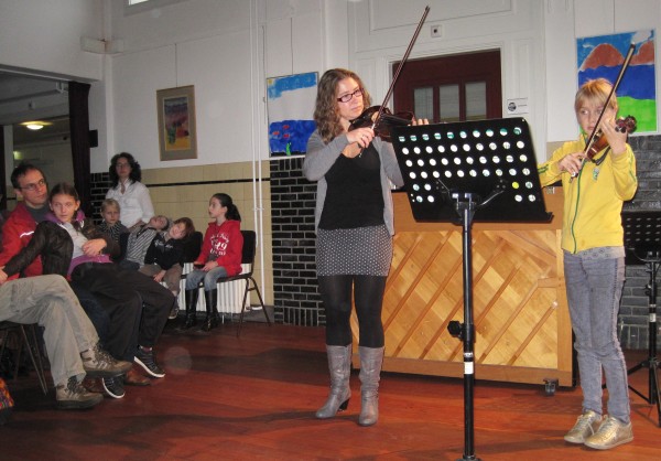 Willemijn heeft een viooloptreden in het Clockhuys in Haren. Samen met de juf speelt ze "Hunting the Hares". |