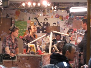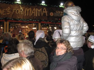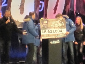 | Als de drie dj's uit het glazen huis komen, lopen ze door een haag van rode kruis vrijwilligers naar het podium. We staan eerste rang. Klik op het plaatje rechts voor de video. |