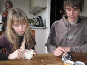 | Op de Noordshow zagen we ze voor het eerst en Willemijn heeft een half uur met een hennetje zitten knuffelen. Serama's zijn kleine dwergkipjes, die sinds kort in Nederland te vinden zijn. Ze zijn zo klein en knuffelig dat ook Marion voor het eerst wat zag in het houden van kippen. Vandaag zijn we naar een kweker in Assen geweest en hebben er twee aangeschaft. Jonge kipjes die nog piepen. Ze zitten in huis terwijl Maarten het buitenhok afmaakt. | ![]() |