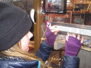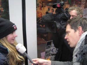 | Bij de brievenbus van het Glazen Huis. | Willemijn doneert namens ons vieren .. | .. en wordt meteen geïnterviewd. |