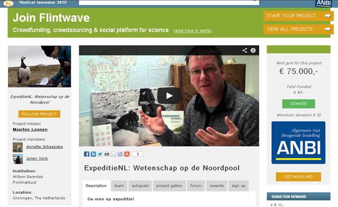 Ik heb veel plannen, maar poolonderzoek is duur. Van de andere kant is er veel belangstelling voor poolonderzoek vanwege de zichtbare gevolgen van klimaatverandering in de poolgebieden. Die twee zaken zijn te combineren door crowd-funding. Verbind mensen en bedrijven met een onderzoek door informatie uitwisseling en sponsoring. Ik liep al enige tijd met dat idee, gebaseerd op bezoeken aan de verenigde Staten, waar dit veel vaker gebeurd. En nu is dat in een stroomversnelling geraakt. Twee instanties helpen mij op mijn plannen te verwezelijken en proberen sponsoren te trekken. Het Ubbo Emmius Fonds van de Rijksuniversiteit Groningen heeft de site gelanceerd rugsteuntstern.nl, en richt zich op alumni. Flintwave is een bedrijf dat bedrijven en personen benaderd voor steun aan de expeditie naar Edgeöya, waarvoor we eerder de Academische Jaarprijs 2012 probeerde te winnen. Op flintwave.com introduceren zij het plan. |
