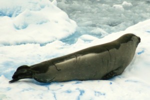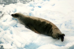 | Als we wakker worden ligt de boot in het drijfijs. Op de grootste ijsschotsen liggen Krabbeneters. Deze grote zeehond