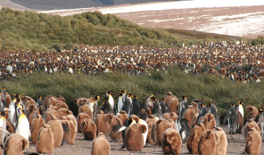| Op South Georgia zijn de grootste kolonies ter wereld. Deze is op Salisbury Plains. Doordat de kolonie doorloopt tegen de berghelling, is het een spectaculaire achtergrond. Op deze foto is mooi te zien hoe de jongen tegen de helling bij elkaar in groepen staan. | ||