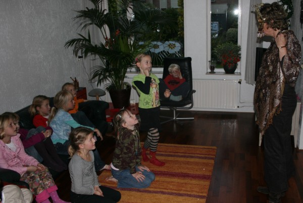 We vieren Willemin's verjaardag een hele nmiddag lang met 11 kinderen. Het weer is niet goed dus we blijhven de gehele dag in huis. Eerst krijgt Willemijn haar kado's door met de ogen dicht één van de gasten aan te wijzen. |