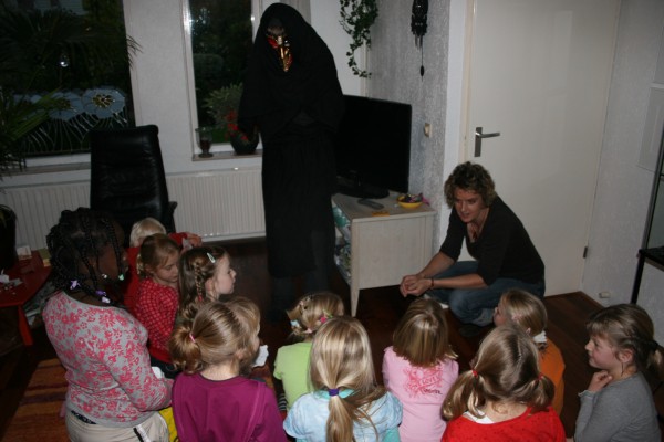| Geïnspireerd door de vakantie in Venetië houden we een speurtocht in huis naar aanleiding van een spannend verhaal met de maskers. Marion geeft een inleiding. Daarna moeten de kinderen één voor één naar boven. De achterblijhvers horen ze steeds ijselijk gillen. | ||