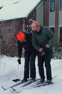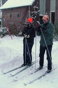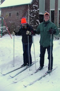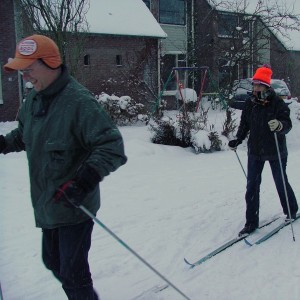 We zijn ingesneeuwd. 17 en 18 december sneeuwt het zoveel, dat al het openbaar vervoer in Nederland even stil valt. We hebben ongeveer 30 centimeter sneeuw in de straat. Ik heb nog nooit zoveel sneeuw in Nederland gezien. Nieuwe mogelijkheden. We hebben de langlaufskies van stal gehaald en maken een rondje in de omgeving. Buurman Jaap zet ons op de foto. Nu dus ook gepubliceerd. | ||