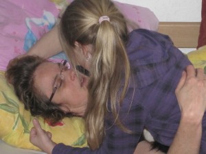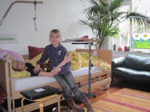 | We laten een ziekenhuisbed komen via ons lidmaatschap van ICARE. Zo blijft Marion nog een beetje meemaken wat er in huis gebeurd. Het is knap hoe ze het geduld kan opbrengen. | ||