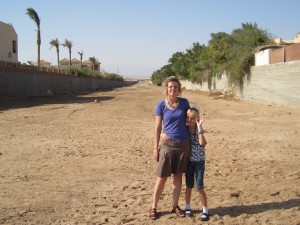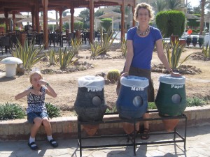 | We gaan dagelijks wandelen en langs winkeltjes. Met het afdingen is het een hele tijdsbesteding. Bijna alles is te krijgen voor de helft van de vraagprijs. Op de linkse foto kopen we parfum. Op de tweede foto staan we in de wadi naast het hotel. De derde foto is de gescheiden afvalinzameling en op de rechtse foto stapt Willemijn in één van de electrische tuktuks van het hotel. | |||||||||