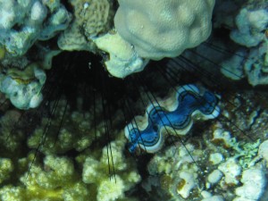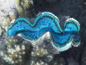 Common giant clam: opvallende blauwe iridiserende mantel, die naar binnen getrokken wordt als er een schaduw langskomt. |