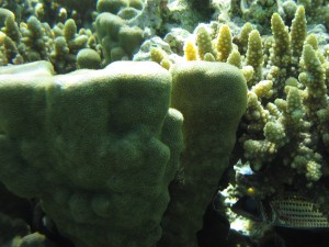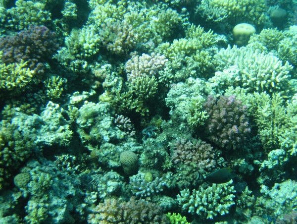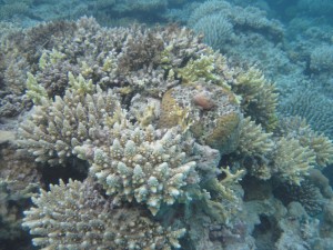 Het koraal zag er veel mooier uit dan we verwacht hadden. Behoorlijk kleurrijk en weinig dode punten. Sommige klompen reiken tot slechts 30 centimeter onder het wateroppervlak. Die ondiepte is meteen ook een toevluchtsoord voor de scholende vis omdat het zelfs voor ons snorkelaars niet begaanbaar is. De golfslag zou je steeds op het koraal duwen. | ||||||||