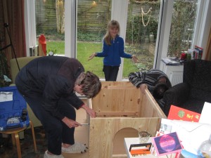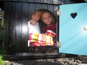 En dan staat het huisje in de tuin. Het raampje krijgt nog twee luikjes en een bloemenbak. Willemijn en Eva passen er samen in. |