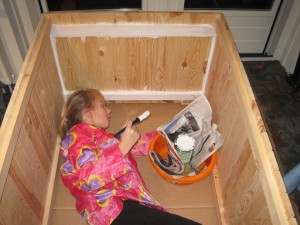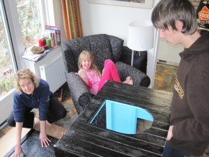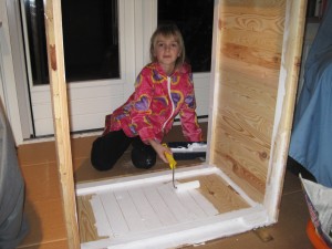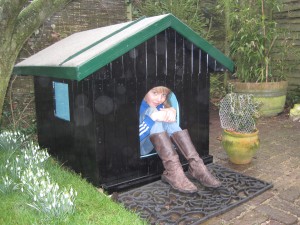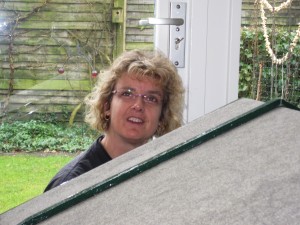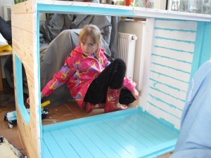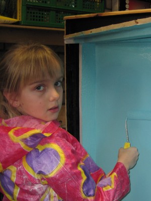 | Willemijn heeft bij Rob en José een tuinhuisje gezien en wil er graag ook één. Bij de Hornbach zien we een houten hondenhok en het plan krijgt meteen vorm. Het huisje krijgt een zijraam en wordt nauwgezet geverfd. Eerst witte grondverf, daarna van binnen hemelsblauw en van buiten zwart. Willemijn krijgt hulp van het gehele gezin maar doet zelf een substantieel deel van het verven. | ![]() |