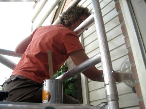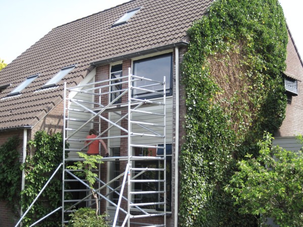 We huren een steiger en Janwillem is vol van de constructie. De hoogte maakt een oergevoel bij hem los. Marion is de specialist in het verven van ingewikkelde plekjes. Maarten is voor de grote vlakken en het plamuren. We hebben toch besloten de slaapplaats van de huismussen in de klimop te knippen. In deze periode van het jaar wordt hij nauwelijks gebruikt en de klimop kwam bijna een meter los van de muur. Het veroorzaakt wel (tijdelijk) een kale plek. |