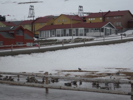 | In het dorp Longyearbyen worden de sneeuwvrije plekjes ook benut door de ganzen. De ganzen zijn tot op minstens 10 meter te benaderen. | |