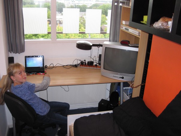 Bed, tafel, kast, gordijn, televisie en bureaustoel heeft hij gekregen van de vorige bewoner. De volgende keer nemen we nog een iets groter en dikker matras mee. Als computer heeft hij een netbook. Klein, maar handig mee te nemen. Inmiddels heeft hij van Esther van Rijssel ook een toetsenbord en een muis gekregen. | |