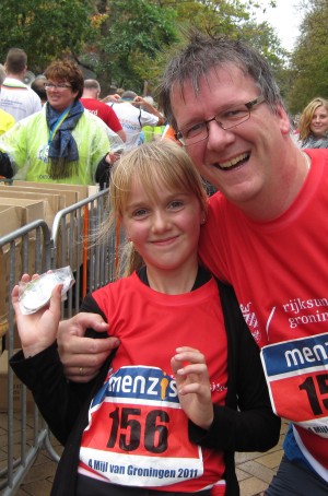 Willemijn loopt met het Arctisch Centrum van de Universiteit mee, met de 4Mijl van Groningen. Het is een hele afstand voor haar en af en toe moet ze even een stukje wandelen, maar ze bereikt de eindstreep in 45 minuten en 20 seconden. Bij de start wordt ze op handen gedragen. Veel publiek langs de route maakt het lopen erg leuk. En een grote medaille aan het einde. |