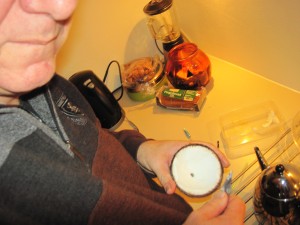 Eén dag na haar verjaardag en verjaardagsfeest staat Maarten om 7:45 uur 31 kokosnoten van gaten te voorzien. Dat gaat gelukkig redelijk gemakkelijk met een schroefboormachine. Kokosnoot nummer 32 wordt doorgezaagd en de kokos uit één helft wordt in kleine stukjes in een bakje verzameld om te proeven. Tenslotte leert Willemijn het geluid te maken van galopperende paarden. En kokosnoot nummer 33 gaat mee, zodat je het klotsen van de kokosmelk kunt horen. Op naar school.... | |
