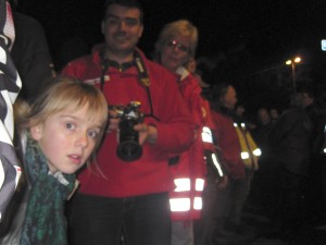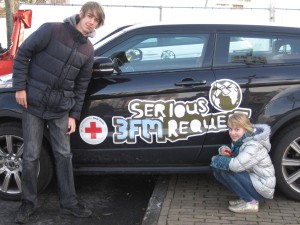 | Als de drie dj's uit het glazen huis komen, lopen ze door een haag van rode kruis vrijwilligers naar het podium. We staan eerste rang. Klik op het plaatje rechts voor de video. |