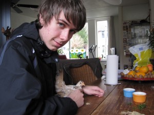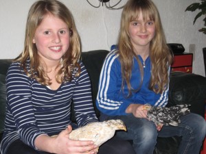 | Op de Noordshow zagen we ze voor het eerst en Willemijn heeft een half uur met een hennetje zitten knuffelen. Serama's zijn kleine dwergkipjes, die sinds kort in Nederland te vinden zijn. Ze zijn zo klein en knuffelig dat ook Marion voor het eerst wat zag in het houden van kippen. Vandaag zijn we naar een kweker in Assen geweest en hebben er twee aangeschaft. Jonge kipjes die nog piepen. Ze zitten in huis terwijl Maarten het buitenhok afmaakt. | ![]() |