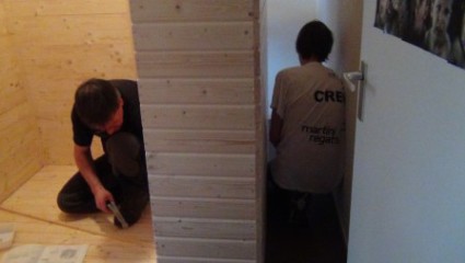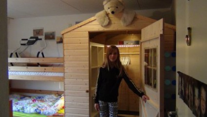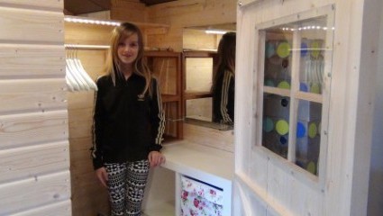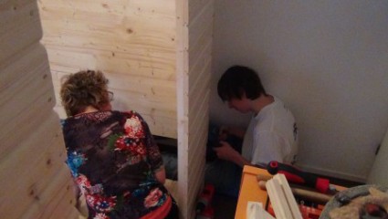 gezocht voor haar gebrek aan kastruimte. Dat is een echte inloopkast geworden. Het was even zoeken, plannen en regelen, maar de kast komt van de Lidl in Duitsland en de bergruimte van Ikea. Het hele gezin is bezig geweest met het in elkaar zetten van het tuinhuisje. Vandaag zijn Willemijn's kleren verhuist. |