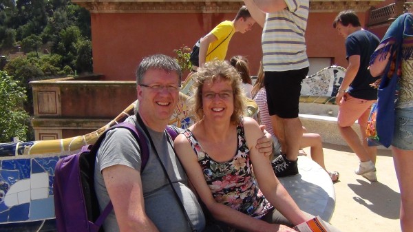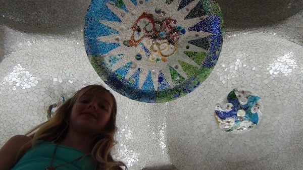 | Parc Guell, ontworpen door Gaudi, op het terras | en een verdieping lager in de zuilengallerij |