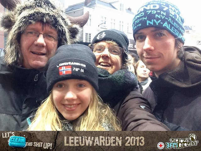 Sinds Serious Request in Groningen heeft gestaan, reizen we op de laatste dag het hele circus achterna om een fantastisch eindfeest mee te beleven en te delen in de goede sfeer van een beetje goed doen. Dit jaar stoind Serious Request in Leeuwarden. We hadden een prima hotelletje geboekt in Workum. Het eindfeest leek mis te lopen in d eregen. Maar omdat we ons goed warm aangekleed hadden en Marion ook nog drie regenponcho's bij haar had, konden we alles aan en stonden dus ineens vooraan. Zeven uur lang de ene naar de andere act direct voor je ogen. Het het plein stroomde steeds voller, zeker toen de laatste twee uur droog werden. Op het laatst deinde het dak van de parkeergarage zo gevaarlijk mee met de springende mensen dat we er bang van werden. Maar weer een heerlijke avond met z'n viertjes. | |