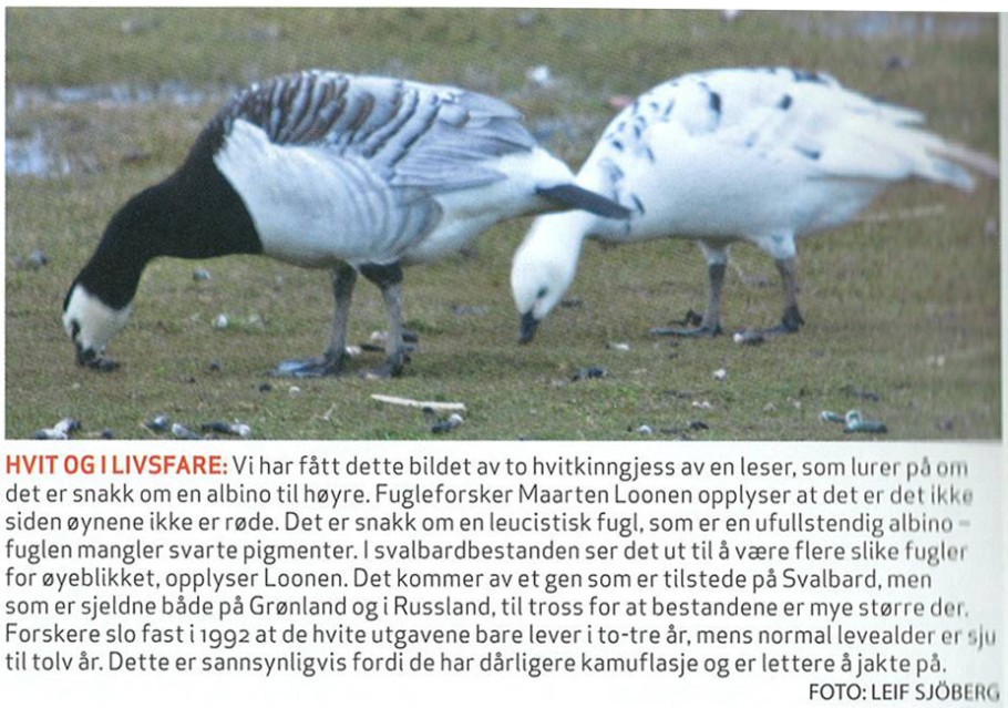 Naar aanleiding van een opgestuurde foto over een witte brandgans, wordt ik in Svalbardposten, de Noorse krant van Spitsbergen, aangehaald als expert. Meer informatie over deze waarneming is ook te vinden op: www.svalbardscienceforum.no | |