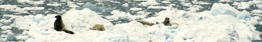 | Als we wakker worden ligt de boot in het drijfijs. Op de grootste ijsschotsen liggen Krabbeneters. Deze grote zeehond