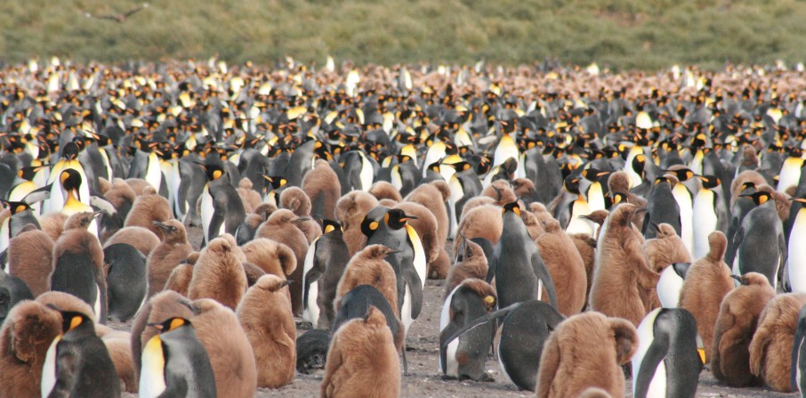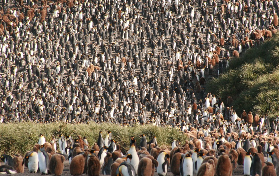 | Op South Georgia zijn de grootste kolonies ter wereld. Deze is op Salisbury Plains. Doordat de kolonie doorloopt tegen de berghelling, is het een spectaculaire achtergrond. Op deze foto is mooi te zien hoe de jongen tegen de helling bij elkaar in groepen staan. | ||